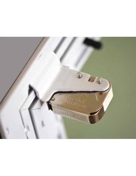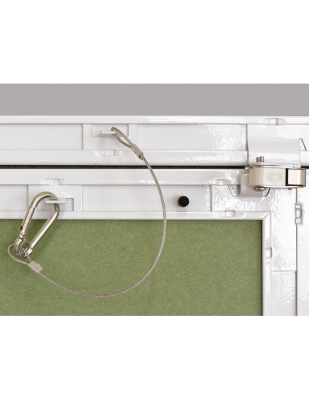 Botola di ispezione in alluminio preverniciato bianco ribordato e rinforzato con dispositivo di apertura click-clack e lastra idro incollata senza viti da stuccare spessore 12,5 mm. Sono presenti, inoltre, anche una guarnizione che funge da filtro antipolvere ed un cavetto di sicurezza in acciaio sganciabile con moschettone.